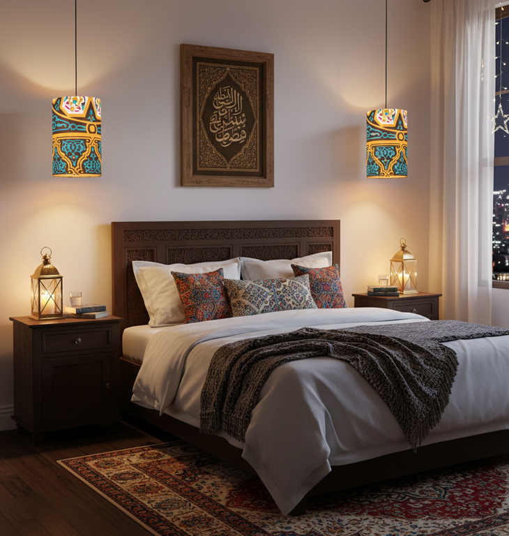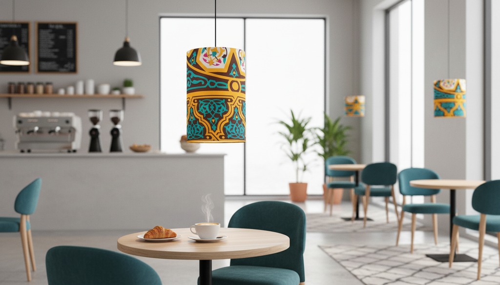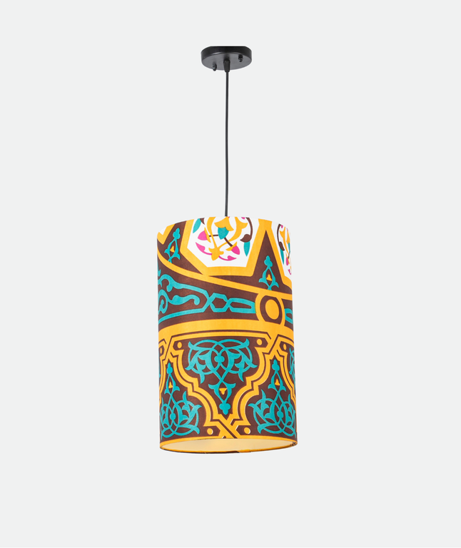 This elegant single Ā pendant light features a tall cylindrical cotton supported fabric shade with vibrant oriental patterns, suspended from a black metal fixture. Designed and made in Egypt, it provides warm and diffused lighting, making it ideal for living rooms, dining spaces, and artistic interiors. A cultural yet modern lighting piece that adds personality to any space.