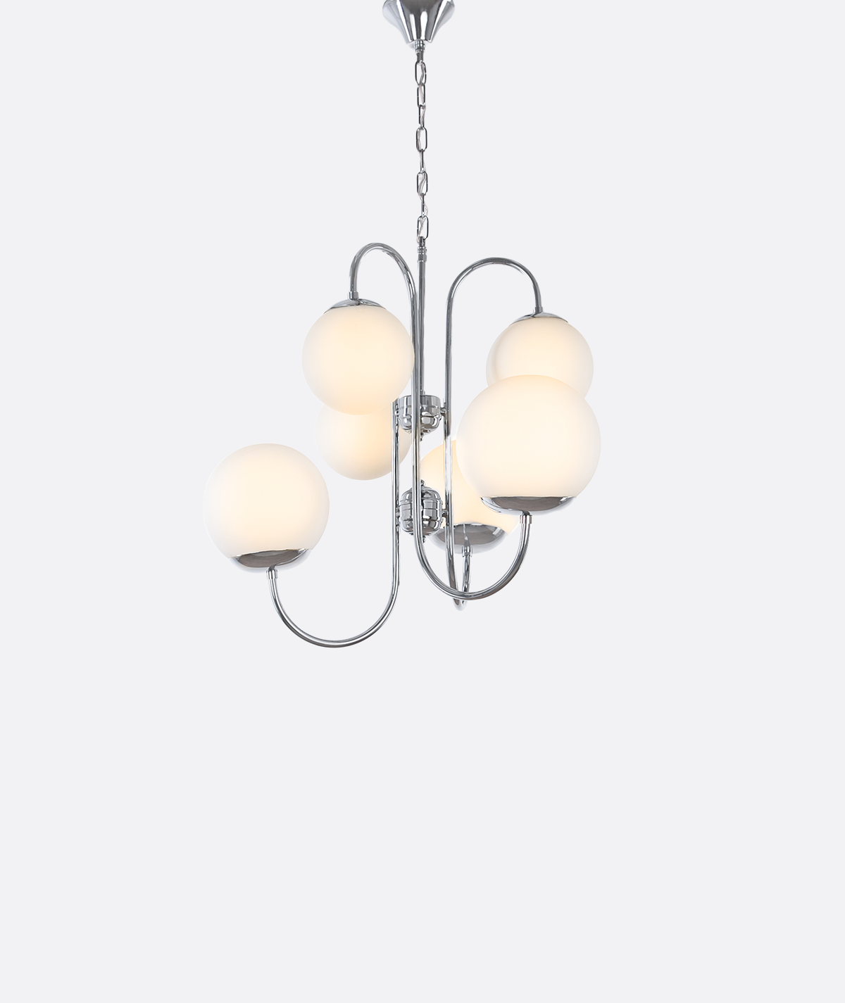 Bring a touch of modern elegance to your home with this branch-style chandelier. Designed with six frosted glass globes gracefully extending from sleek curved arms, it creates a soft, warm ambient glow perfect for living rooms, dining areas, and reception spaces.,