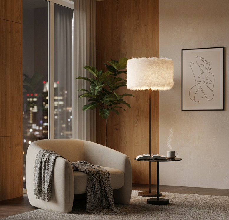 “Black floor lamp with sleek steel body and a unique black faux fur shade, blending modern elegance with a bold glam touch. Handcrafted for stylish interiors, this statement lamp adds warmth and sophistication to living rooms, bedrooms, and reception spaces.”