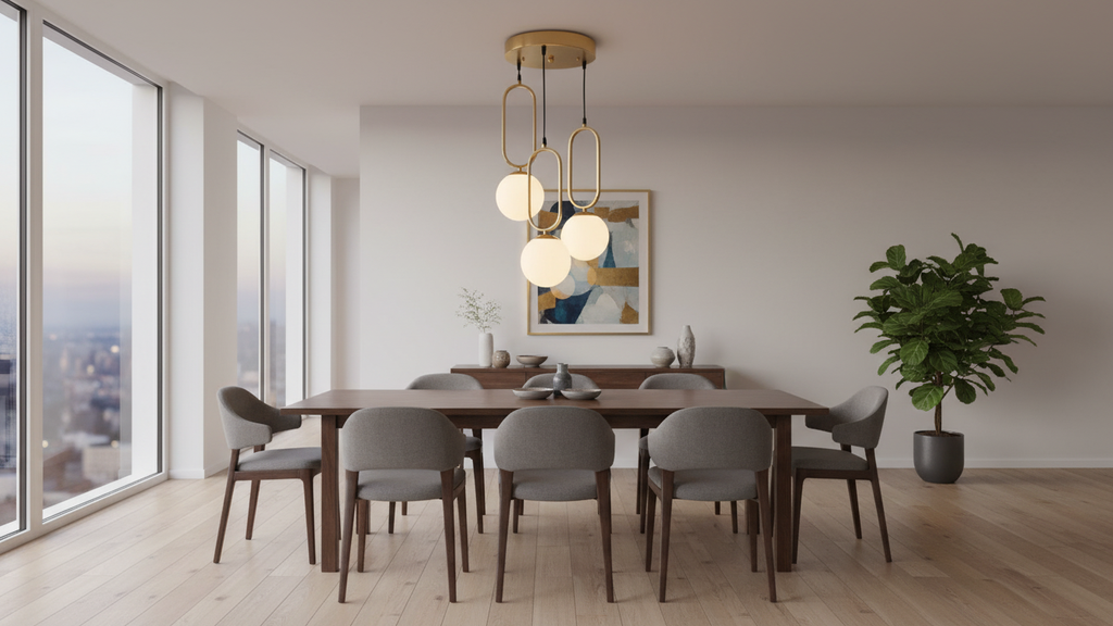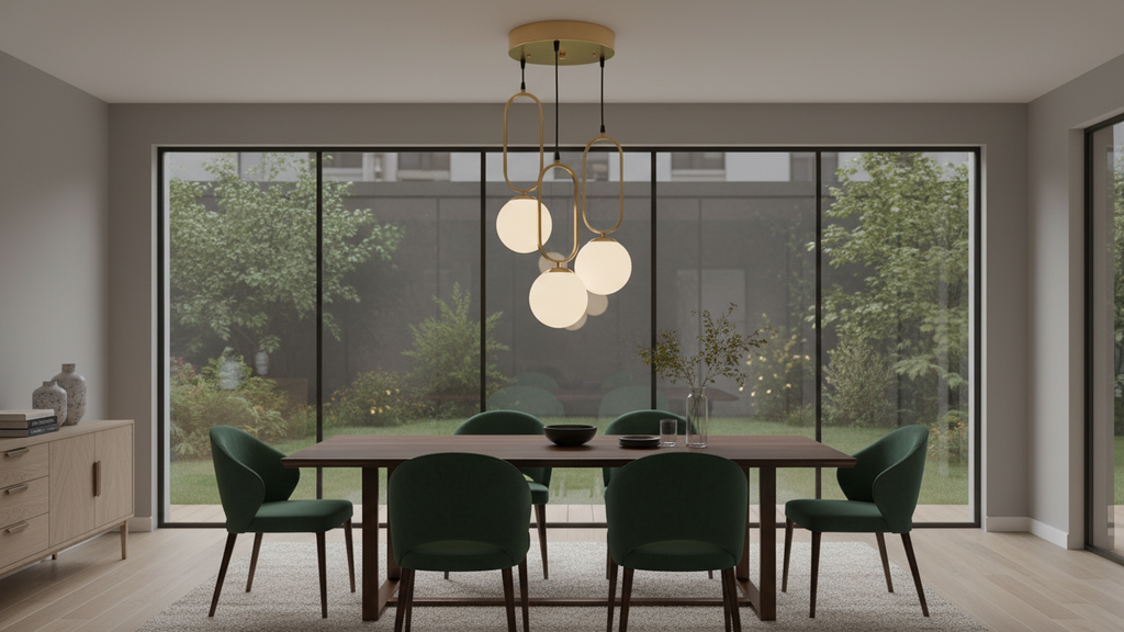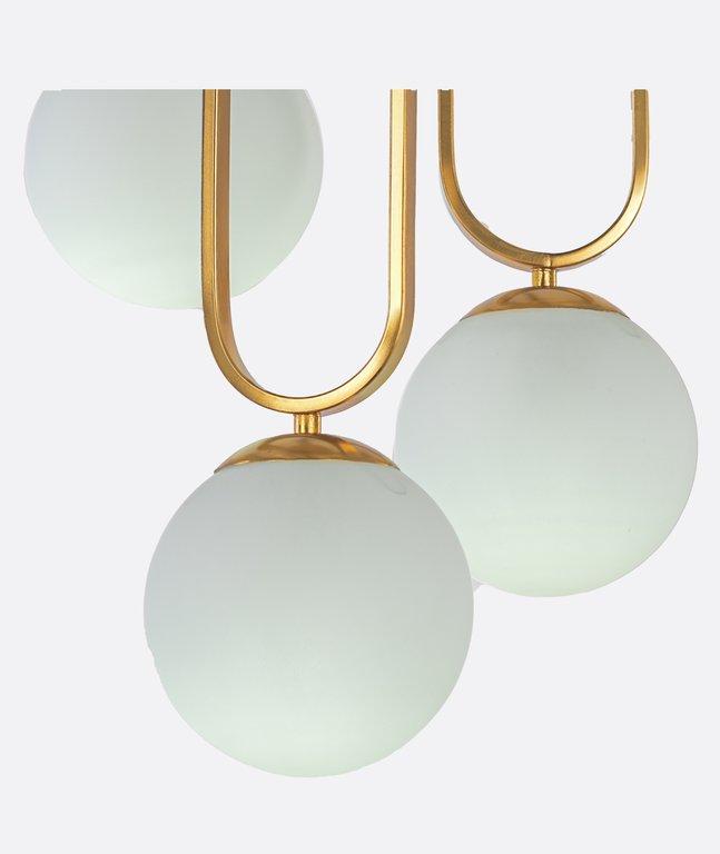 A modern pendant ceiling combines luxurious brass with elegant opal glass globes, creating a sophisticated centerpiece for any room. Its sleek geometric design provides soft ambient lighting, perfect for dining rooms, living areas, or entryways. A stylish blend of modern design and timeless elegance