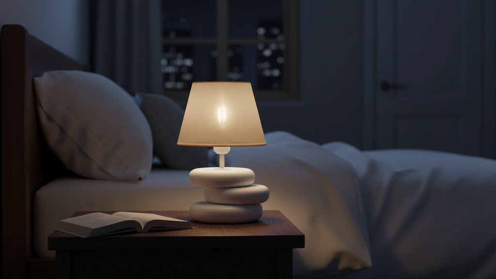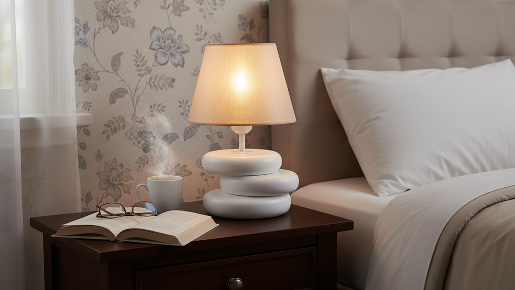 Modern table lamp featuring a stacked white wooden base with a beige fabric shade, blending mesh textures with a contemporary touch. Its warm ambient lighting makes it perfect for bedrooms, living rooms, side tables, and stylish interiors in Egypt. A great choice for those searching for modern table lamps, fabric shade lamps, modern decorative lighting, and bedside lamps in Egypt.